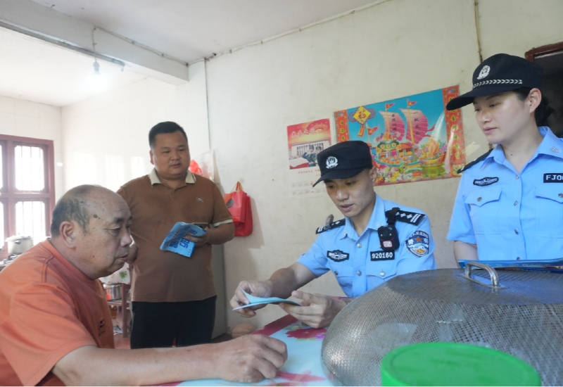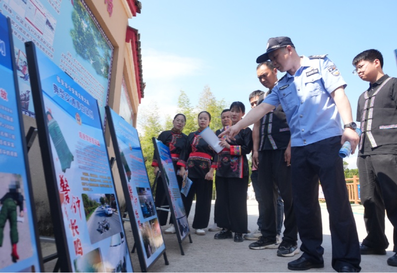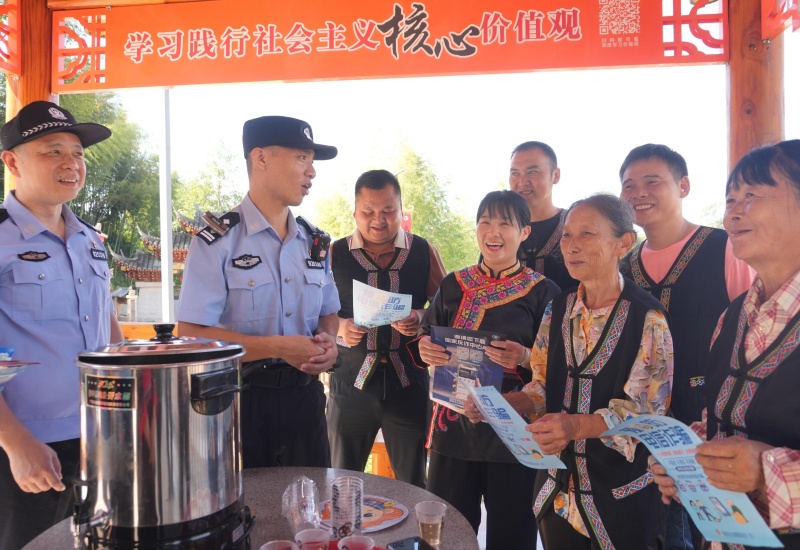 交通安全宣传则聚焦畲乡山路多、农用车使用频繁的特点,民警通过摆放事故案例展板、播放畲语安全提示音频,重点讲解“骑乘摩托车戴头盔”“农用车不载人”“山路会车减速让行”等规则,还走进村内畲族作坊、小卖部,向村民发放印有畲族图腾的交通安全贴纸,让安全知识伴着民族文化符号,深深印在群众心中。