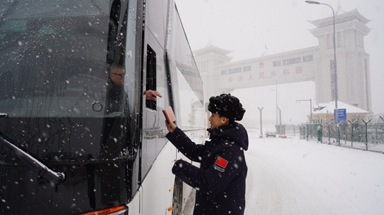 中经联播绥芬河25日电(通讯员田晓慧)受强冷空气影响,黑龙江省绥芬河市遭遇强寒潮与暴雪天气,局部地区出现“风吹雪”现象,道路湿滑且能见度低。时值2026年春运伊始,面对极端天气对口岸通关带来的严峻挑战,绥芬河出入境边防检查站迅速启动应急预案,口岸执勤民警顶风冒雪,全力确保国门安全畅通,守护旅客平安顺遂回家路。