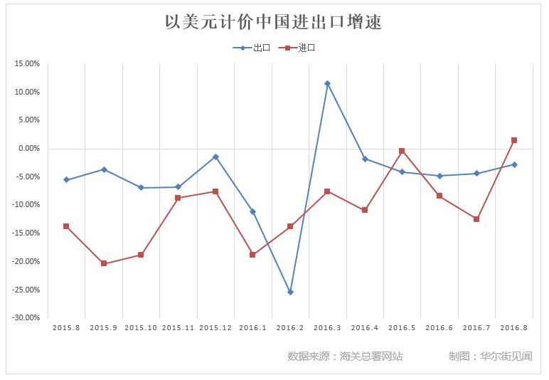 以人民币计价,8月进口9250亿元,同比大幅增长10.8%,好于预期的0.7%,和上月的-5.7%。以美元计稍差,8月进口同比增1.5%,但也为2014年11月以来首次转为正值。大幅好于预期的下滑5.4%,7月为下滑12.5%。