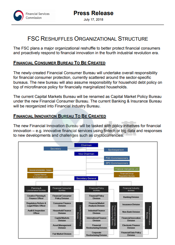 据韩国金融服务委员会(FSC)官方文件,FSC已于7月17日成立了一个专门针对该国加密货币行业的部门—金融创新局,旨在制定加密货币政策并助力金融科技行业。据Ethnews,业内人士猜测此举或暗示韩国准备接受加密货币和区块链技术。