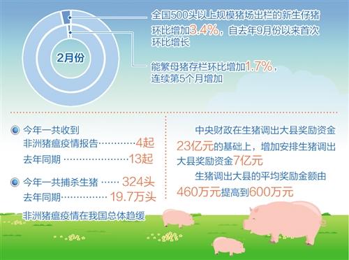 目前,生猪生产持续保持向好势头。农业农村部监测数据显示,2月份,能繁母猪存栏环比增加1.7%,这已是连续第5个月增加;全国500头以上规模猪场出栏的新生仔猪环比增加3.4%,实现自去年9月份以来首次环比增长。