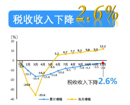 一:全年税收收入下降2.6%,圆满完成财政预算安排的税收收入目标。2020年,全国税务部门组织的税收收入(已扣除出口退税)完成136780亿元,同比下降2.6%,圆满完成财政预算安排的税收收入目标。从全年走势看,税收收入增速自3月份“触底”后连续9个月回升,反映了我国经济复苏向好的势头,但受疫情和落实减税降费影响,全年税收收入下降2.6%。“十三五”时期,全国税收收入完成65.7万亿元,比“十二五”时期增加18.5万亿元,为经济社会发展提供了坚实财力保障。