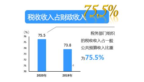 二:税务部门组织税收收入占财政收入的比重为75.5%,比2019年提升1.7个百分点。2020年,税务部门组织的税收收入占一般公共预算收入比重预计为75.5%,比2019年提升1.7个百分点。与“十二五”末的2015年相比,2020年税收收入占财政收入比重提升了2.9个百分点,显示“十三五”时期税收为国聚财职能持续增强。