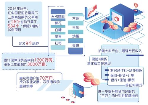 2016年以来,在中国证监会指导下,三家商品期货交易所在26个省份开展了584个“保险+期货”试点项目,涉及天然橡胶、棉花、白糖、苹果、红枣、大豆、玉米、鸡蛋、豆粕9个品种,累计保障现货规模约1200万吨,承保土地面积约3000万亩,惠及贫困户近70万户,成为农业发展、农民增收的重要保障。