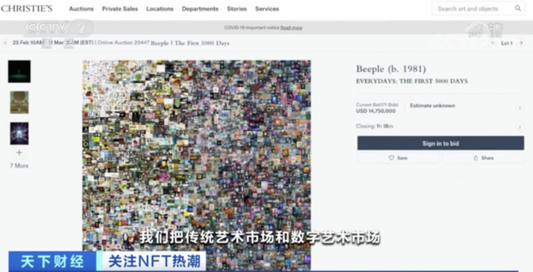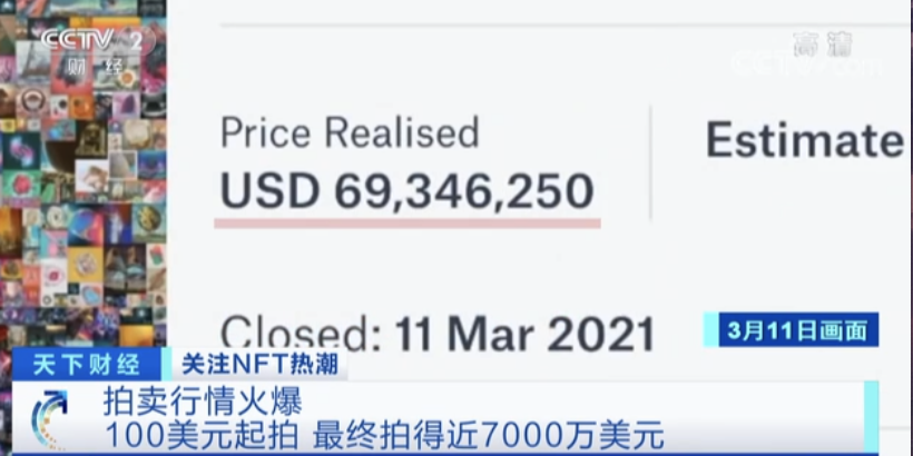 基于这一技术特点,NFT艺术作品的交易自去年底开始升温,截至目前,最著名的一笔交易,来自今年3月11日,国际拍卖行佳士得成交的一幅总价近7000万美元,约合人民币4.5亿元的NFT画作。