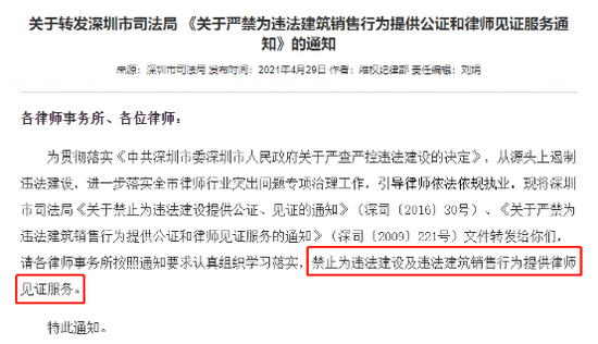 4月29日,深圳市律师协会转发深圳市司法局通知,禁止各律师事务所、各位律师为违法建设提供公证、见证和为违法建筑销售行为提供公证和律师见证服务。