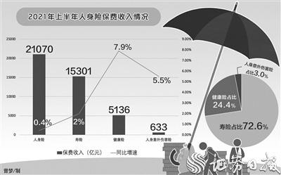 从不同险种的贡献来看,寿险保费大幅拉低了人身险整体保费增速。今年上半年,寿险保费为15301亿元,占人身险比重72.6%,同比下滑2%;健康险保费为5136亿元,占比24.4%,同比增长7.9%;人身意外伤害险保费633亿元,占比3.0%,同比增长5.5%。不难看出,今年健康险独挑大梁,增速远高于寿险,但占比仍有较大提升空间。
