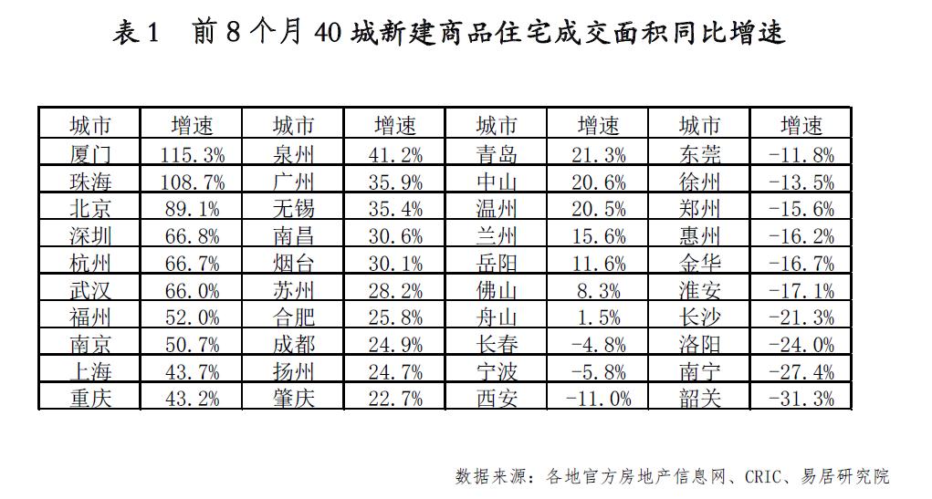 从城市来看,前8个月,40城新建商品住宅成交面积同比增速排名前十的城市依次为:厦门、珠海、北京、深圳、杭州、武汉、福州、南京、上海、重庆。