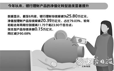 今年以来,银行理财产品的净值化转型速度显著提升。银行业理财登记托管中心发布《中国银行业理财市场半年报告(2021年上)》报告显示,截至6月底,银行理财存续规模为25.80万亿元,净值型理财产品存续规模20.39万亿元,占比79.03%,较年初和去年同期分别提高11.75个和23.90个百分点;保本型产品存续余额0.15万亿元,同比减少90.68%。
