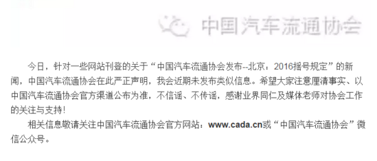 报道中,消息来源为中国汽车流通协会,网易汽车第一时间致电中国汽车流通协会副秘书长沈荣。“此消息不实,我们没有发布这样的消息,而且这类消息也不应该由流通协会发布,”沈荣称。此后,中国汽车流通协会也在官方微信发表声明: