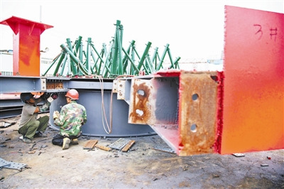 昨天,北青报记者在北京首钢建设钢结构公司重钢分厂看到了用来支撑篮体的钢结构骨架——中心桶和花篮底座。另外还有花盘、花篮四周地面上用来摆花用的外围坡架。这些骨架的总重量达到近100吨。