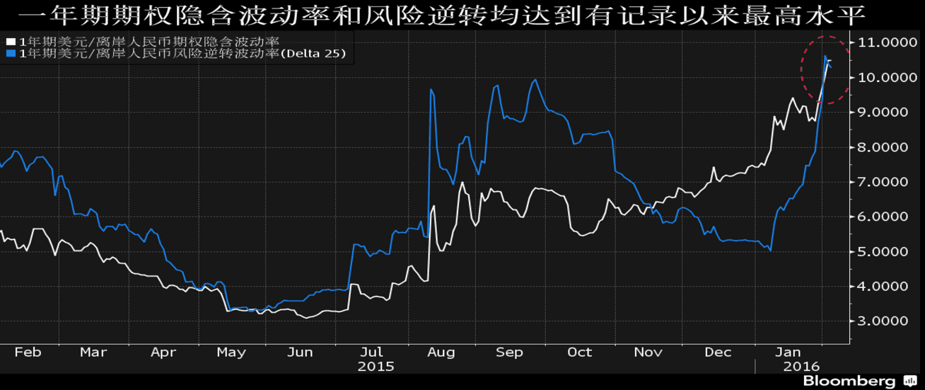 期权市场的波动急剧加大,恰恰反映了人民币市场平静的表面之下涌动的暗潮。截至纽约时间周二17:00, 一年期美元/离岸人民币期权隐含波动率上涨至历史最高点10.50%,一年期美元/离岸人民币风险逆转(delta值为10)期权波动率报10.395%,也接近历史最高值。