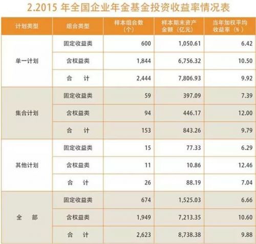 据国家人力资源和社会保障部官网公开发布的“2015年度全国企业年金业务数据摘要”显示,总共7.5万家企业建立了企业年金,2316万职工参保,2015年底积累的基金金额为9525.51亿元,比2014年底的7689亿元激增了近2000亿元,其中2015年的投资收益为753.91亿元。从收益率看,统计显示,2015年企业年金加权平均收益率为9.88%,高于2014年的9.3%和2009年的7.78%,创下了过去8年来的新高。