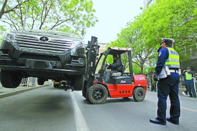 和以往清拖违停车辆主要使用清障车不同,这次参与执法的“大杀器”是社会单位支援的叉车。杨熠说,在道路比较窄的支路或胡同里,清障车因空间限制难以使用,叉车个头小一点,但作用很大,直接从侧面上叉子,安全高效。