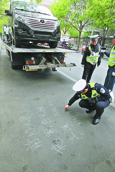 车子拖走,交警在原来停车的位置用粉笔写上了交通队电话和清拖情况,要求司机尽快去交通队接受处罚。杨熠说,即使粉笔写下的通知被涂抹或者雨水冲刷掉,或者司机没注意到,只要他拨打电话报警,就会被及时告知情况。