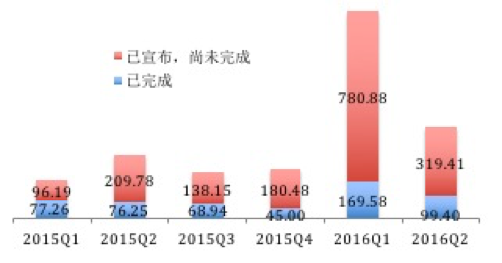 根据商务部的数据,2016年第二季度中国对外非金融类直接投资487.7亿美元,较上季度环比增长了21.65%,较上年同期同比增长了61.44%。然而,与中国ODI整体保持快速增长形成对比,中国企业海外并购的步伐却有所放缓。该季度,中国已完成和已宣布尚未完成的海外并购总金额418.81亿美元。其中已完成交割的海外并购99.4亿美元,新宣布尚未完成的海外并购43.72亿美元,还有275.70亿美元的海外并购交易等待相关监管部门批准。无论是对于已完成的还是已宣布尚未完成的海外并购交易,与第一季度相比,投资额均有不同程度的降低。其中,已完成的海外并购金额环比大幅降低了41.38%。