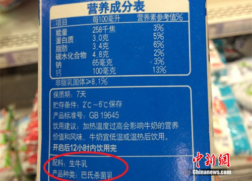 北京某超市销售的一款巴氏奶,配料显示为“生牛乳”。中新网 邱宇 摄