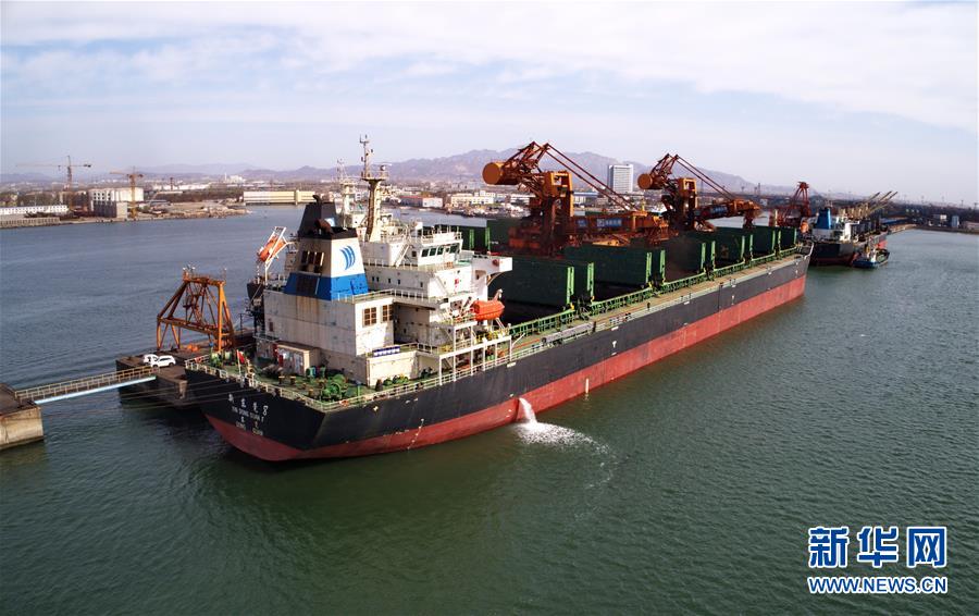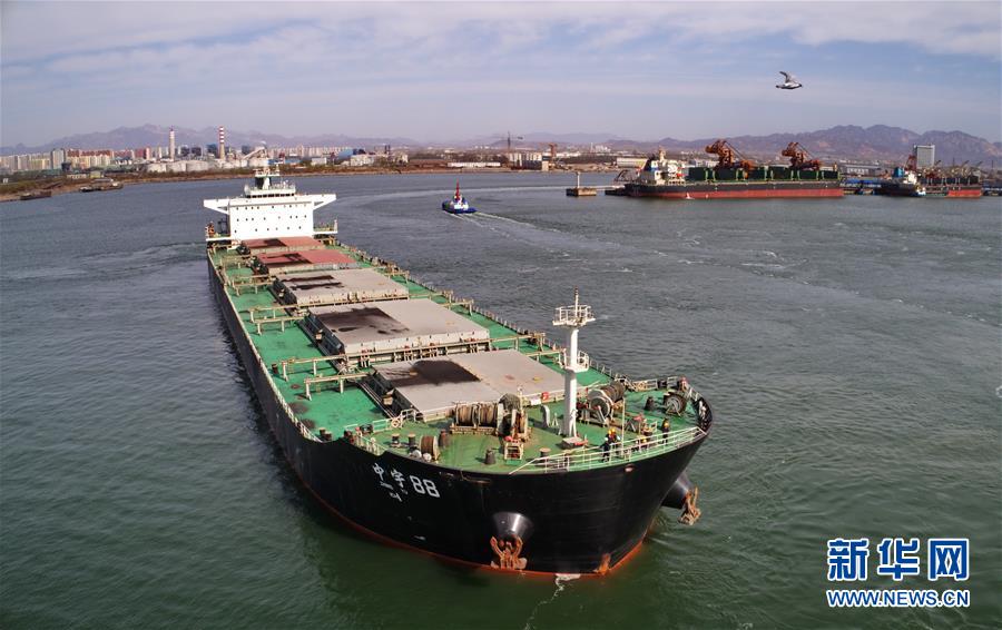 4月11日,一艘轮船在秦皇岛港煤炭码头装完货后离港。记者从河北港口集团获悉,该集团2017年一季度货物吞吐量达9185万吨,同比增长22.27%。新华社记者 杨世尧 摄