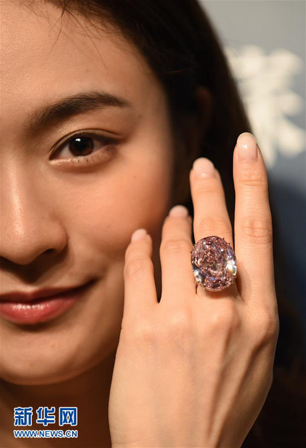 2017年4月4日 59.60克拉粉红钻香港拍卖创纪录模特在香港苏富比艺术空间举行的媒体预展上展示“粉红之星”钻石(3月29日摄)。 4月4日,一枚名为“粉红之星”的59.60克拉椭圆形内部无暇艳彩粉红钻在香港苏富比瑰丽珠宝及翡翠首饰2017年春拍上以总额5亿5303.75万港元(约合7120万美元)拍出,创下世界钻石珠宝类拍卖最高价纪录。新华社记者刘昀摄