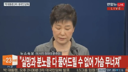 最后,朴槿惠再次向国民衷心表示道歉。希望两党能尽快齐心协力,解决当前局面。
