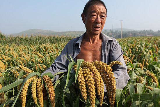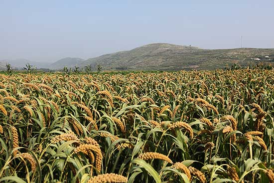 8月23日,山东省临沂市平邑县黄草坡村的有机谷子丰收在望。
