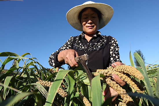 9月7日添加到日历,二十四节气中的白露时节,山东省临沂市平邑县万亩山地有机谷子喜获丰收,金色谷穗染黄大地,农民们忙着收获,山坡上、田野间、农院里一派忙碌的丰收景象。图为村民在收获成熟的山地谷子
