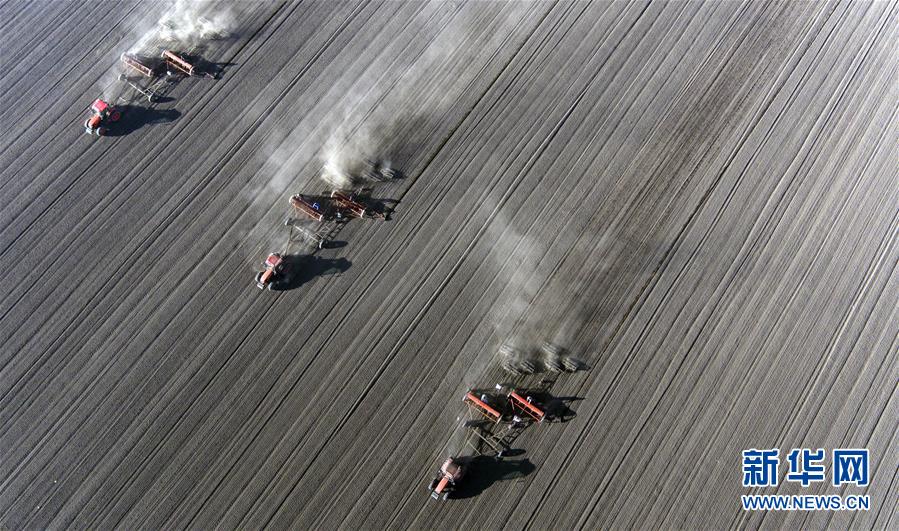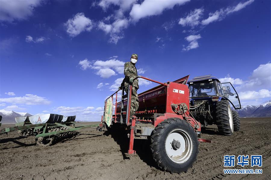 5月12日,青海省三江集团门源种马场的工人驾驶农机播种。初夏时节,位于祁连山脚下的青海省海北藏族自治州门源回族自治县50万亩油菜田迎来播种季。门源县地处祁连山南麓,海拔较高,无霜期短,当地以种植油菜、青稞为主,每年7、8月油菜花绽放后将形成“百里油菜花海”的壮美景观。新华社记者张宏祥摄