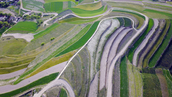 盛夏时节,甘肃省通渭县山间的梯田层层叠叠,色彩斑斓,在黄土高原上绘制出一幅幅美丽的画卷。