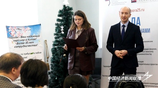 俄滨海边疆区妇女创业发展委员会主席叶列娜·瓦西里耶夫娜·杰米坚科致欢迎辞(右一)