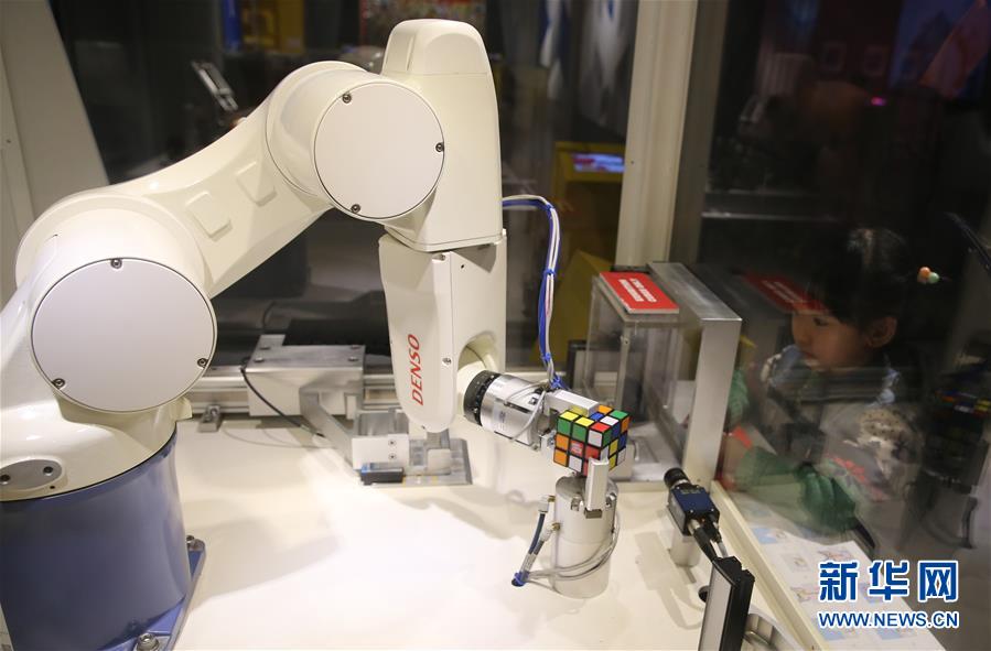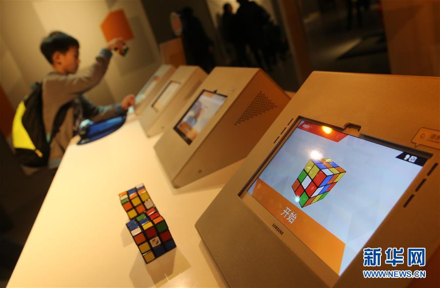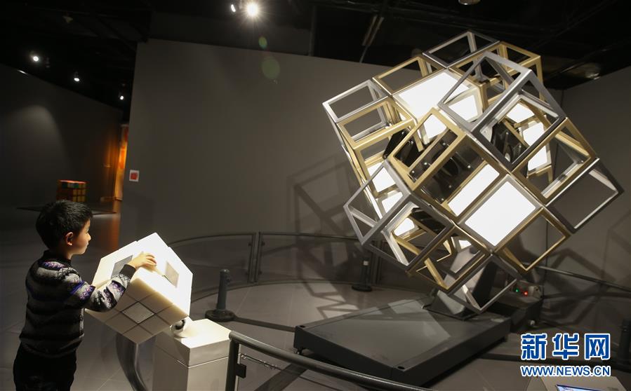2月8日,一名小观众在展馆内学习如何玩魔方。近日,由魔方之父厄尔诺·鲁比克参与打造的“超越魔方”科技互动展览在上海环球港博物馆举办,24件创意交互展品让观众充分体验了魔方的魅力以及魔方在艺术、时尚、科技、设计等领域的跨界影响力。新华社记者裴鑫摄
