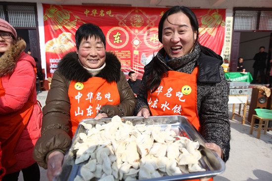 图为村民展示在水饺大赛上包好的水饺。
