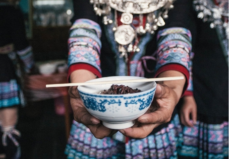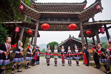 寨前下车,穿过载歌载舞、夹道欢迎的芦笙队伍,来到一排拦路的美丽姑娘面前,她们每人手捧一碗自家酿造的糯米酒,一边唱歌,一边将酒碗端到每位客人面前,客人们只有顺从地喝下姑娘手中的美酒才会被准许放入寨子。否则……姑娘就会一直不停地唱下去,直到每一位客人都接过酒碗“咕咚...咕咚...”地把酒喝下去。