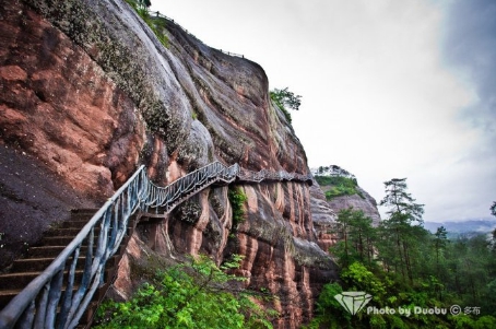 从我们下车进山门起,天空一直淅淅沥沥地飘着细雨,顺着在丹霞山体上凿出的曲折石阶,很快就走到了那段缠绕着绝壁修建的悬空栈道上。这段栈道走起来步步惊心,扶着栏杆往下看,雾气中的幽暗山谷深不可测,即便没有恐高症,腿也不由得有点抖。