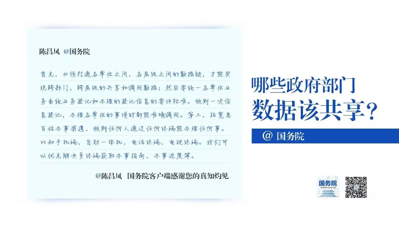 我希望国家能够首先推行在同一系统下的信息完全共享,而后再在部门间搭建整体的信息共享平台。 把民众的跑腿转移到互联网中。