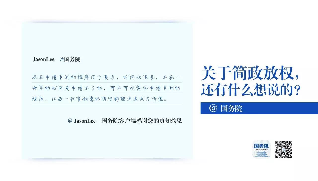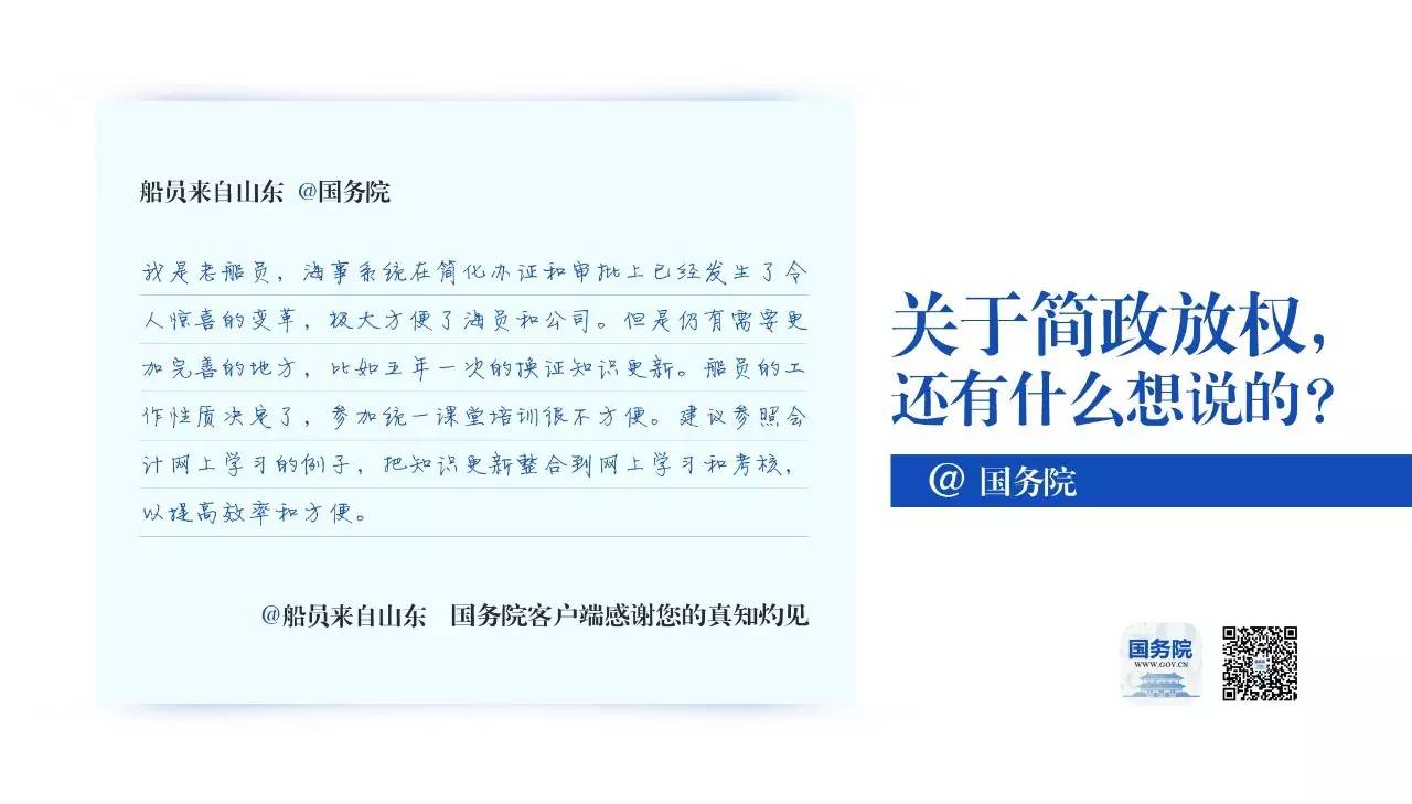 如你所期待的, “简政放权,我来@国务院”意见征集活动第二期精选留言与你见面了。此刻,这个活动正在全国4000多个省、市、县级的政务服务大厅进行,在活动开展的这一个月里, 老船员、药店经营者,培训学校负责人,市场监管员,为父母异地医保报销操心的儿女,为专利申请焦心的创业者……越来越多的人参与活动,留下了他们的声音。根据活动规则,我们从中选出了第二期幸运网友,并将他们的留言制成了明信片,这些明信片与神秘礼物将会在一周内寄出。@国务院的你,来自中南海邮局的快递正在路上,请注意查收;还没有@国务院的你,期待你的真知灼见,我们天天在线。
