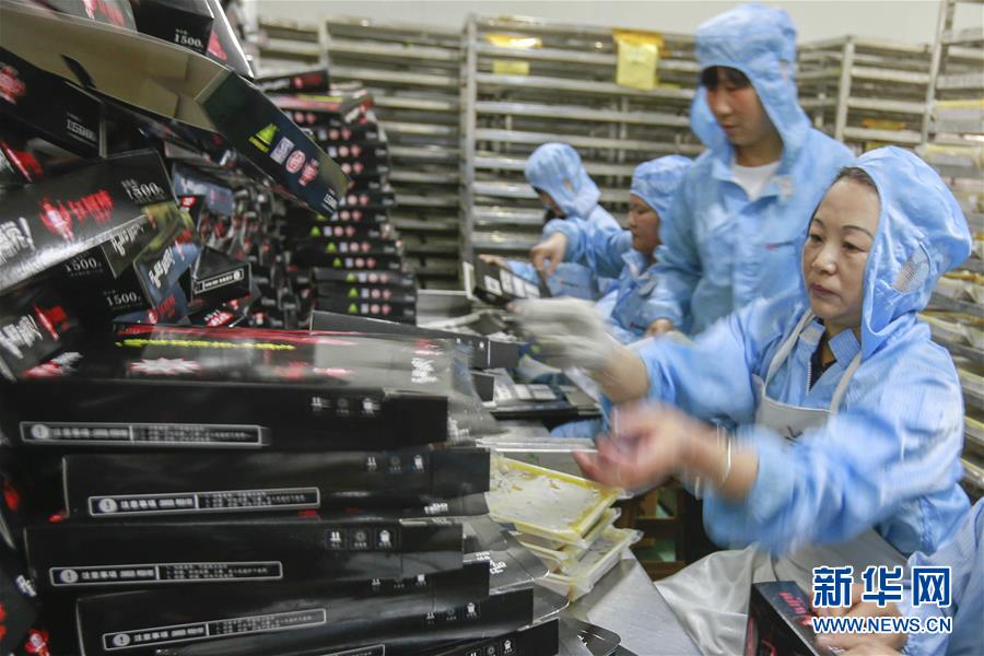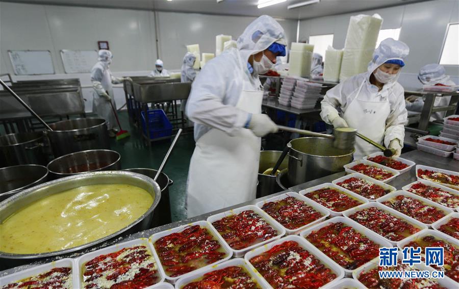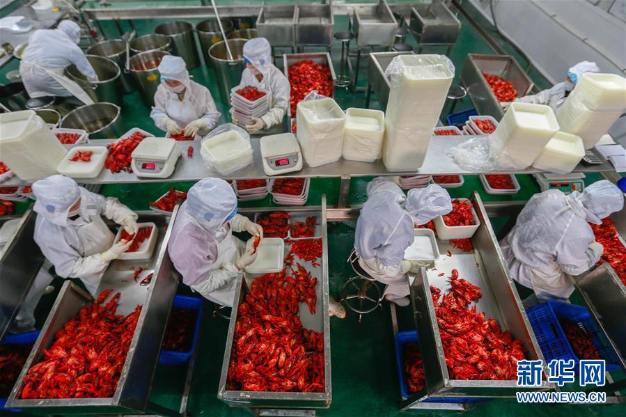 6月4日,江苏省盱眙县泗州城小龙虾加工公司的工人在生产线上作业。地处江苏中部的淮安市盱眙县是我国著名的“龙虾之乡”。近年来,当地不断开拓市场,在产品创新和冷链物流方面提档升级,生产的小龙虾产品在供应国内市场的同时,出口澳大利亚、马来西亚等国家和地区,年产值超百亿元。新华社发(周海军 摄)
