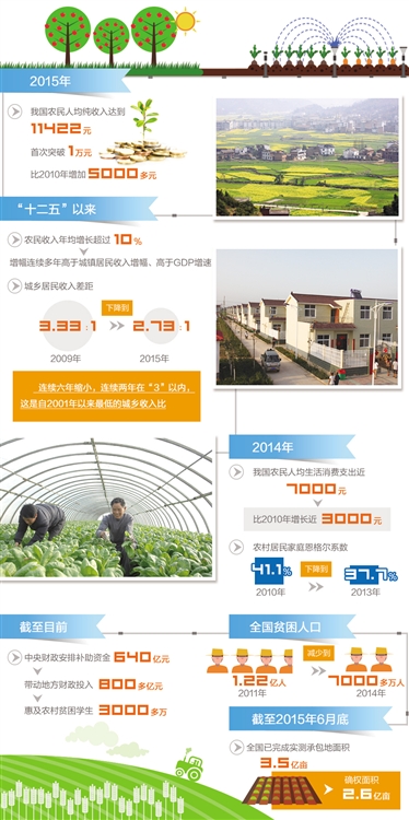 现实中,衡量农民收入是否实现快速增长有两个参照:一是看收入增速是否超过同期GDP的增速,二是看收入增速是否超过城镇居民收入增速。“十二五”以来,农民收入年均增长超过10%,增幅连续多年高于城镇居民收入增幅、高于GDP增速。城乡居民收入差距由2009年的3.33∶1下降到2015年的2.73∶1,连续六年缩小,连续两年都在“3”以内,这是自2001年以来最低的城乡收入比。