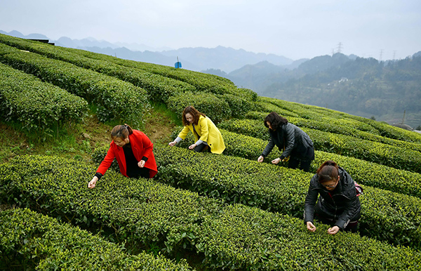 3月21日,游客在湖北省宣恩县“伍家台贡茶”茶园体验采茶。