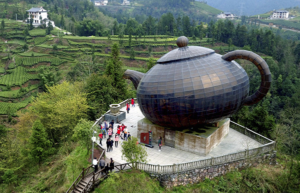 3月22日,游人在湖北省宣恩县伍家台茶山上参观巨型茶壶景观。