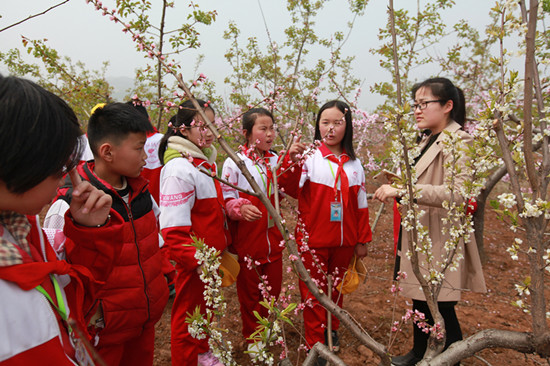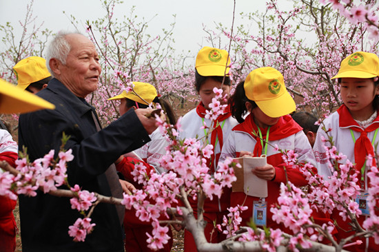 4月10日,山东省平邑县地方镇金池完小的学生在桃园里听农技人员讲解桃树开花结果过程。