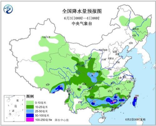 图2 全国降水量预报图(6月2日08时-3日08时)