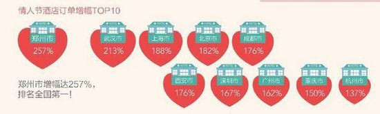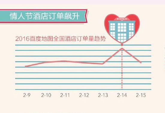2 月14日,某婚恋网站发布了2015年度中国男女婚恋观调查报告,其中6701元的恋爱起步价引发了社会热议。这个情人节刚过去三天,今晚(2月17日)百度地图根据2月14日全国酒店预定情况发布报告,报告显示,情人节当天地图酒店订单量超过2015国庆黄金周订单量峰值,北京订单量最高。而郑州市以酒店订单量增长257%排增幅最高城市榜首。