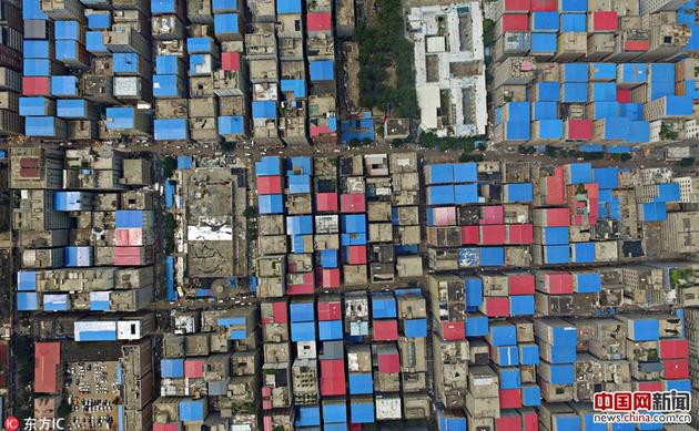8月24日,河南郑州市的最大城中村陈寨即将开拆。从空中看陈寨,楼房栉比鳞次,大部分楼房房顶,全部是蓝色或红色的彩钢瓦。
