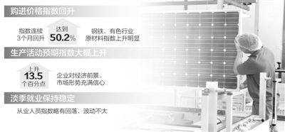 从12个分项指数来看,同上月相比,出口订单、积压订单、产成品库存、购进价格、原材料库存、生产活动预期6个指数有所上升,其余6个指数有所下降。其中,生产活动预期指数升幅最高,为13.5个百分点;购进价格指数为50.2%,比上月上升5.1个百分点。