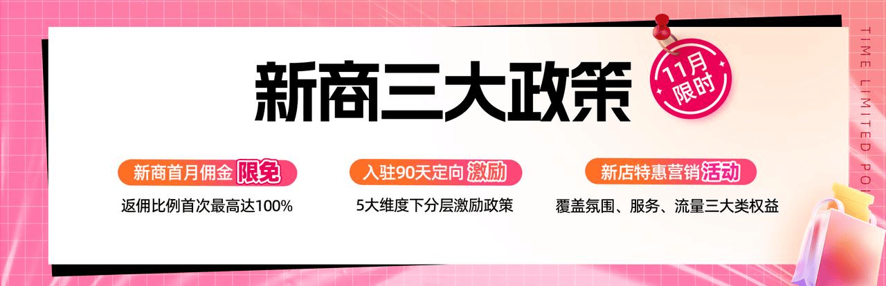 「入驻90天定向激励」是双11头商加码/商家自播/好货上新/达人合作/货架经营5大维度下分层激励政策,通过任务+权益激励的方式助力新商在入驻后90天内能提升运营能力、获取更多流量、快速成交出单;「新店特惠营销活动」是覆盖氛围、服务、流量三大类权益的“新店特惠”定制化营销活动,为新商量身打造长期营销阵地,帮助商家快速提升冷启成长进程。