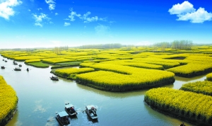 要欣赏水上盛开的油菜花,最佳去处就是江苏泰州兴化的缸顾乡东旺村。每年油菜花季,兴化乡间被流水分开的垛田就会形成了上千个湖中小岛,岛上开满了金灿灿的油菜花,在水面上形成一大片金黄色的“千岛花海”,独具特色。