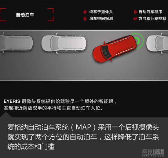 也有更简便的,麦格纳便有一套全新的自动泊车系统,它只用一个彩色摄像头就能搞定自动泊车(当然,如果厂商需要,也可以与泊车雷达联用,实现遥控泊车),这样只需要一个摄像头,在成本方面也能更好控制,有利于这项技术的普及(凭什么经济型车不能用高技术?……)。