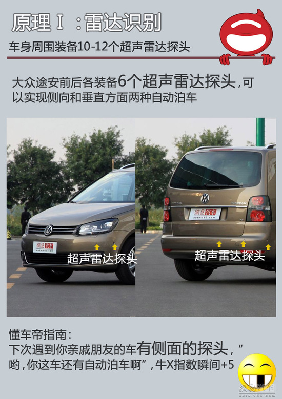 目前市面上常见的自动泊车系统大体上有两种:一是采用多个超声波雷达探头,探测车位和障碍物,并经过计算,停入车位;二是通过多个摄像头,同样采用一套算法,让车辆停入其中。前者在欧美车型上较为常见,而后者多见于日系车型。