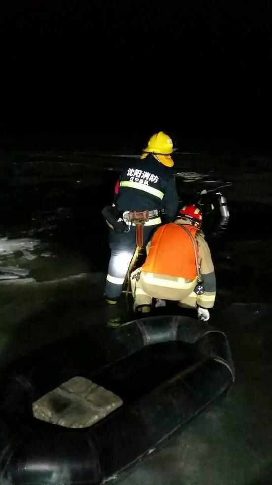 沈阳消防特勤队员立即用气垫床靠近落水冰面,并安排潜水员下水打捞男子。由于冰面太薄,其他冰面上的消防救援人员也多次落水。