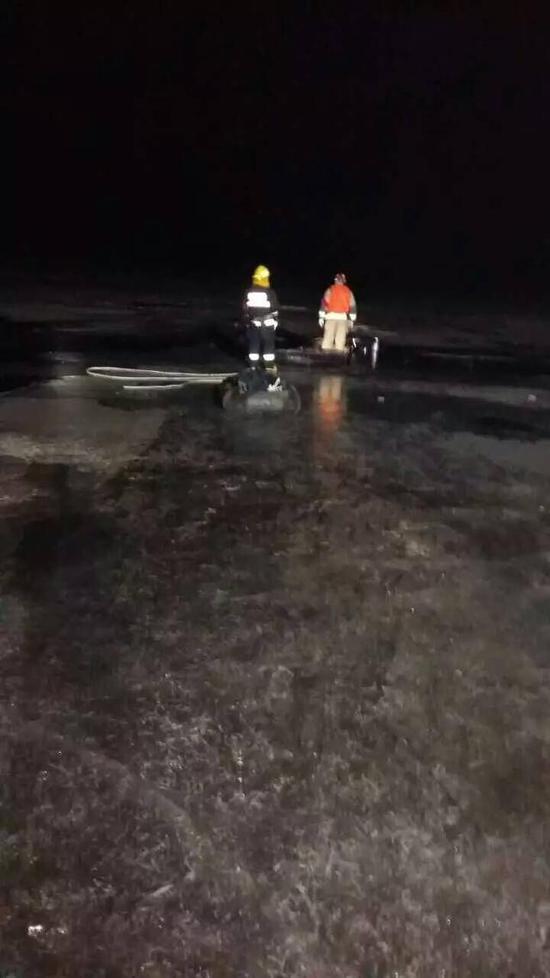 现场,消防人员并没有看到事发吉普车,而冰面上裂开的巨大窟窿里,吉普车已经下沉。据现场目击者称,吉普车的驾驶员还没有获救。而13岁女孩和孕妇成功从吉普车内逃生,并从冰面上获救。